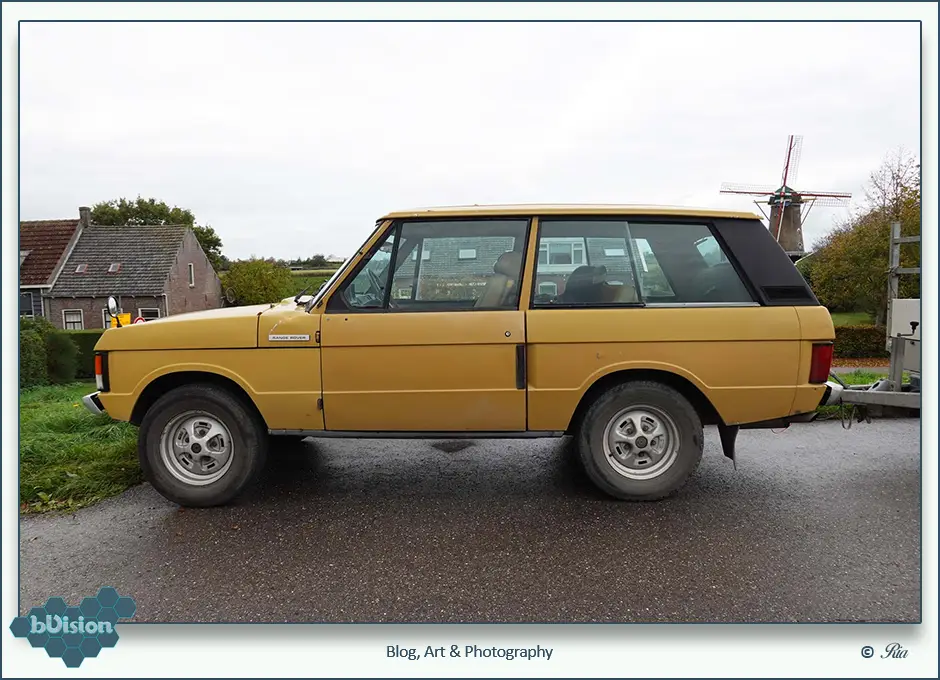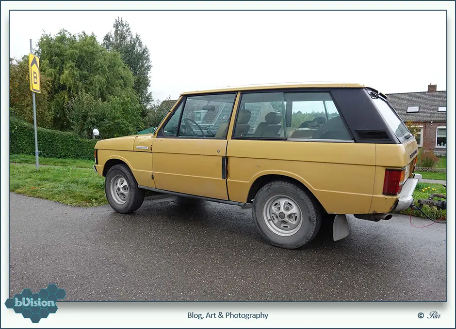 Ria van haar weblog riavanfelius.nl vond langs de dijk, geparkeerd vanwege asfalteringswerkzaamheden, deze gele Range Rover uit 1974. Een stationwagen met karakter. Met zijn 8-cilinder motor van 3528 cc en 126 pk is hij geen lichtgewicht, maar een robuuste klassieker die nog dagelijks wordt gebruikt.